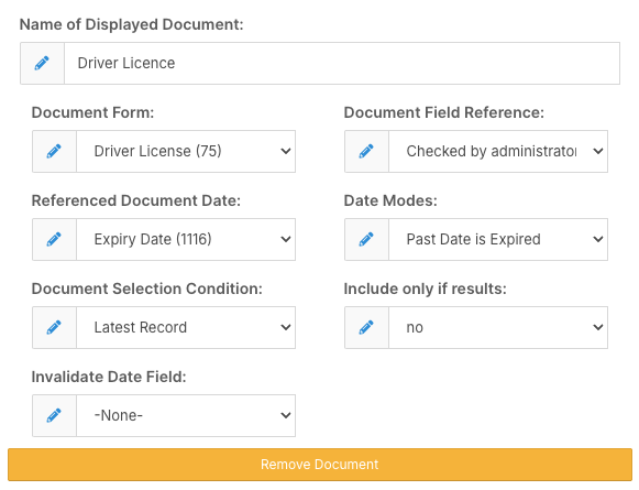 Document rules can track uploads, expiry dates, and completion status.