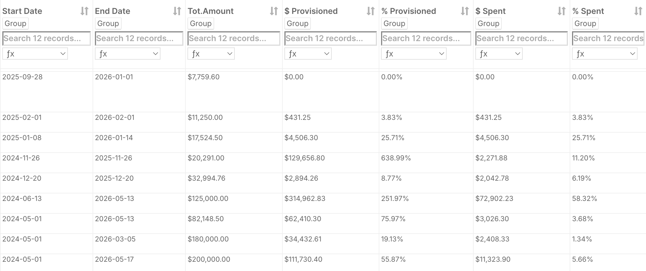 This report lists all expiring budgets and shows the allocation label, form, start and end dates, and total budget amounts, including provisioned, spent, and remaining values in both dollar amounts and percentages. Group by client to view budget details for individual participants.