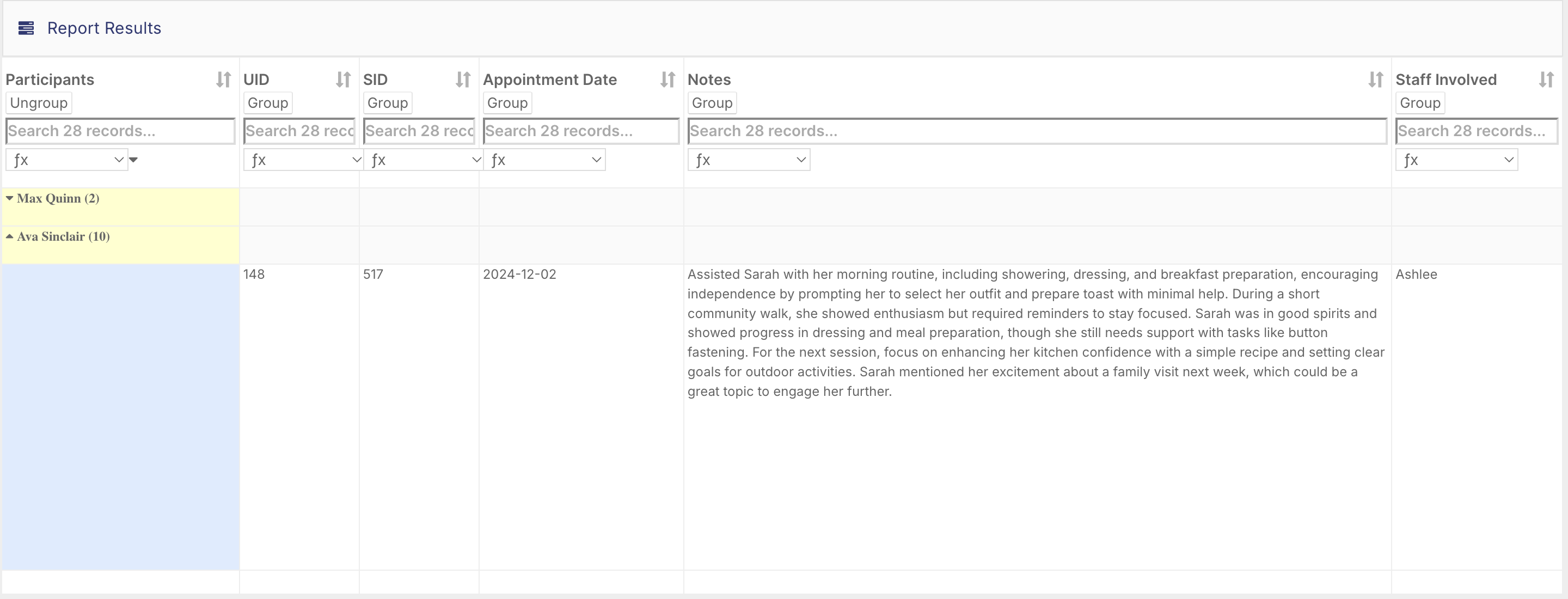 A useful tip is to group the report by participant so all notes for a specific client appear together. You can then filter by that client and export only their records, which is far quicker than searching through individual profiles.