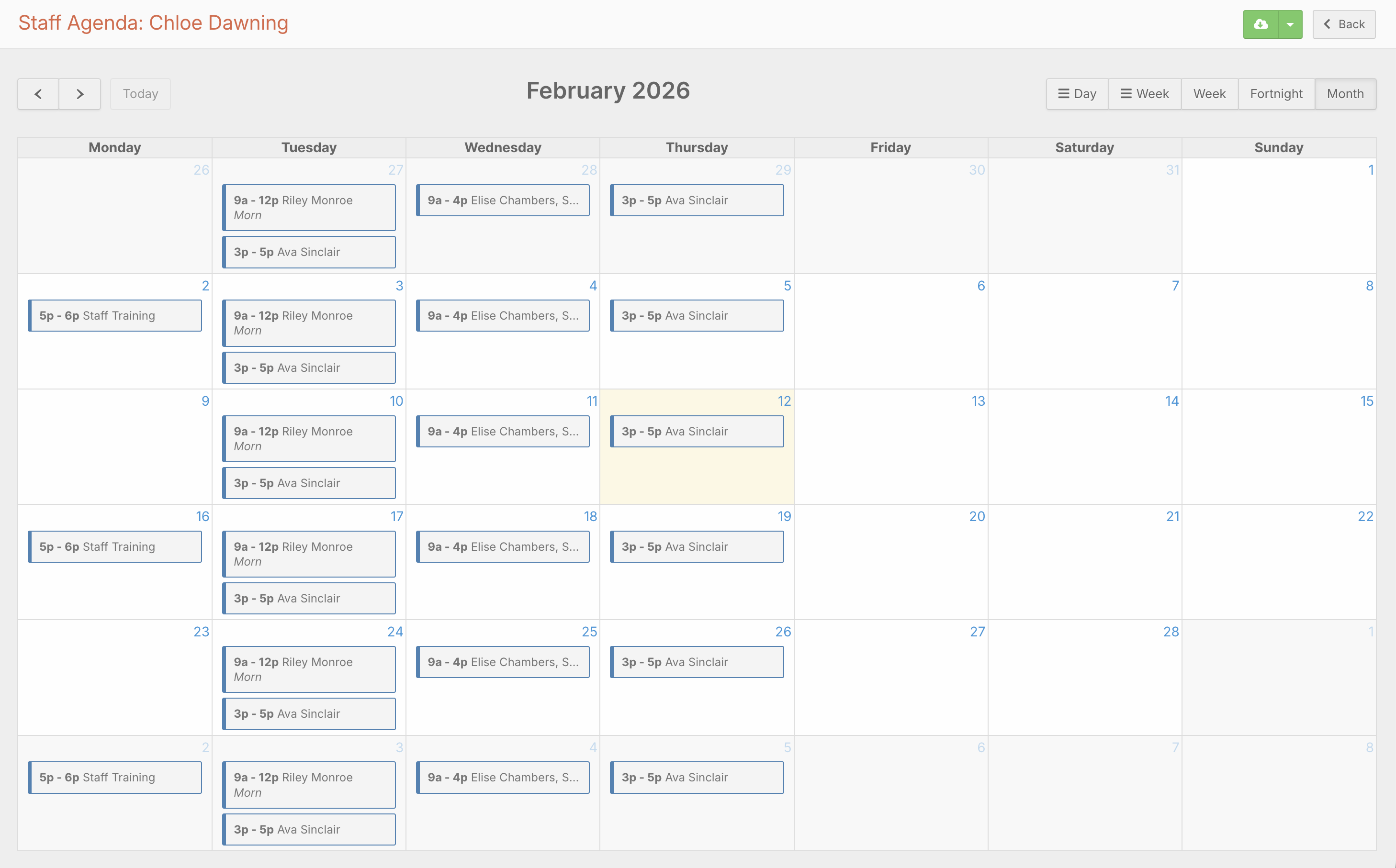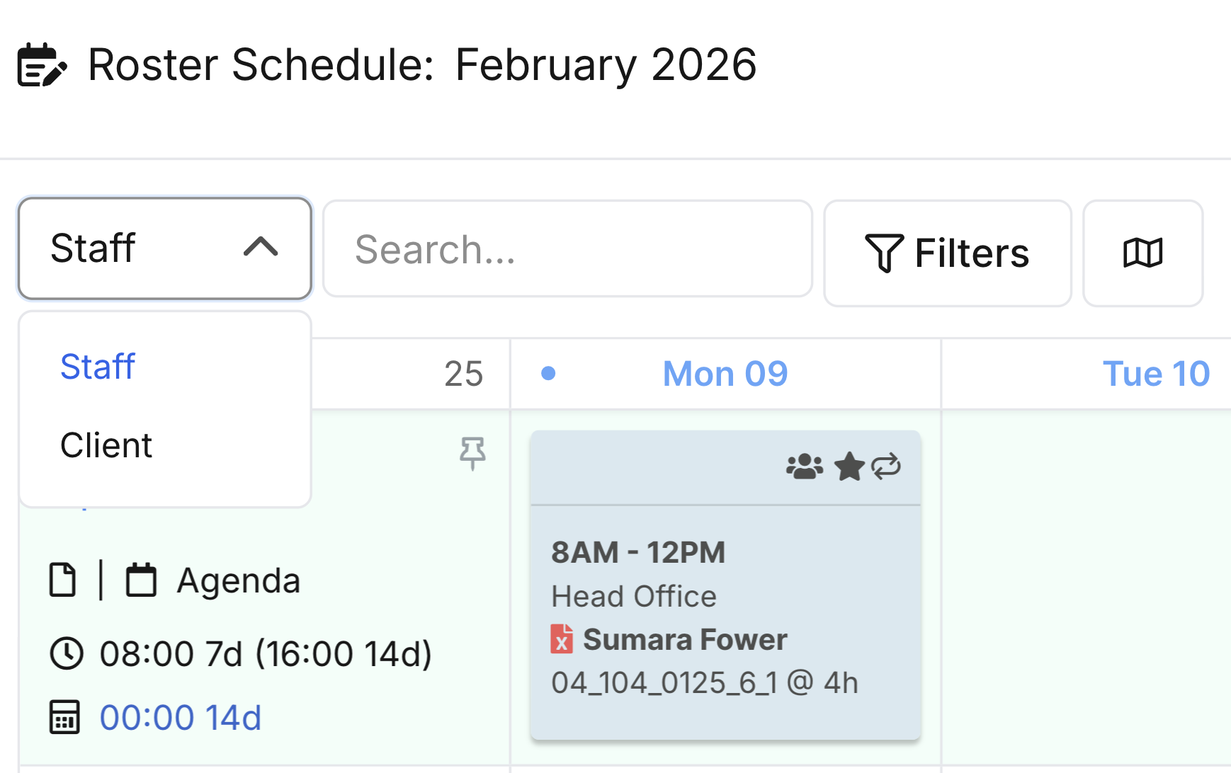Use the search field to quickly locate staff or clients by typing a few letters.